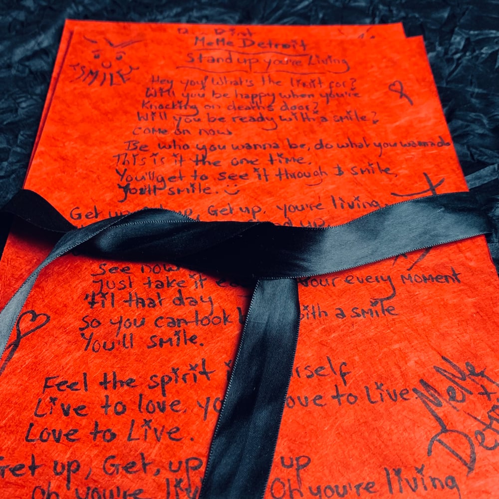 You can now pick up your very own chosen lyric sheet out of every single song ever written and released, personally handwritten and doodled by MeMe Detroit!